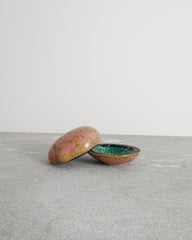 - A rare and small decorative mid century pink and yellow glazed stoneware box with a green inside by the Swedish ceramist Hans Hedberg produced by Biot in southern of France, 1950s
