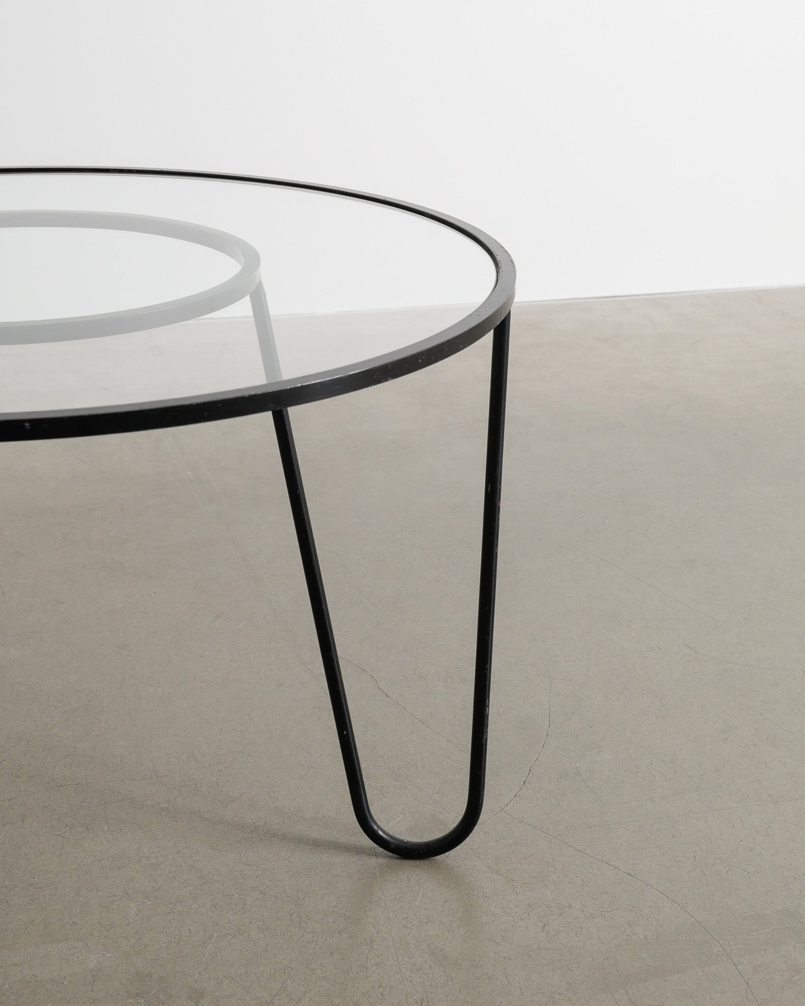 - A rare round French mid century "Bellevue" side sofa table in black lacquered metal with a glass top designed by Mathieu Matégot in 1955 and produced in France, 1950s
